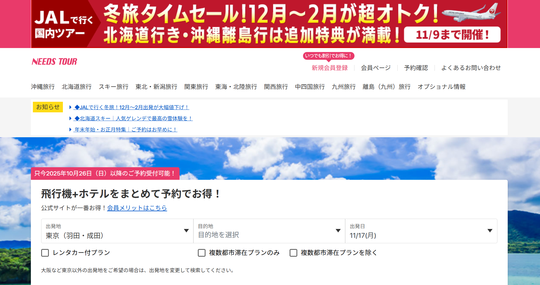 会員向けの限定情報や特集も充実。忙しい年末進行の合間でも、短時間で“納得の冬旅”が決まります。