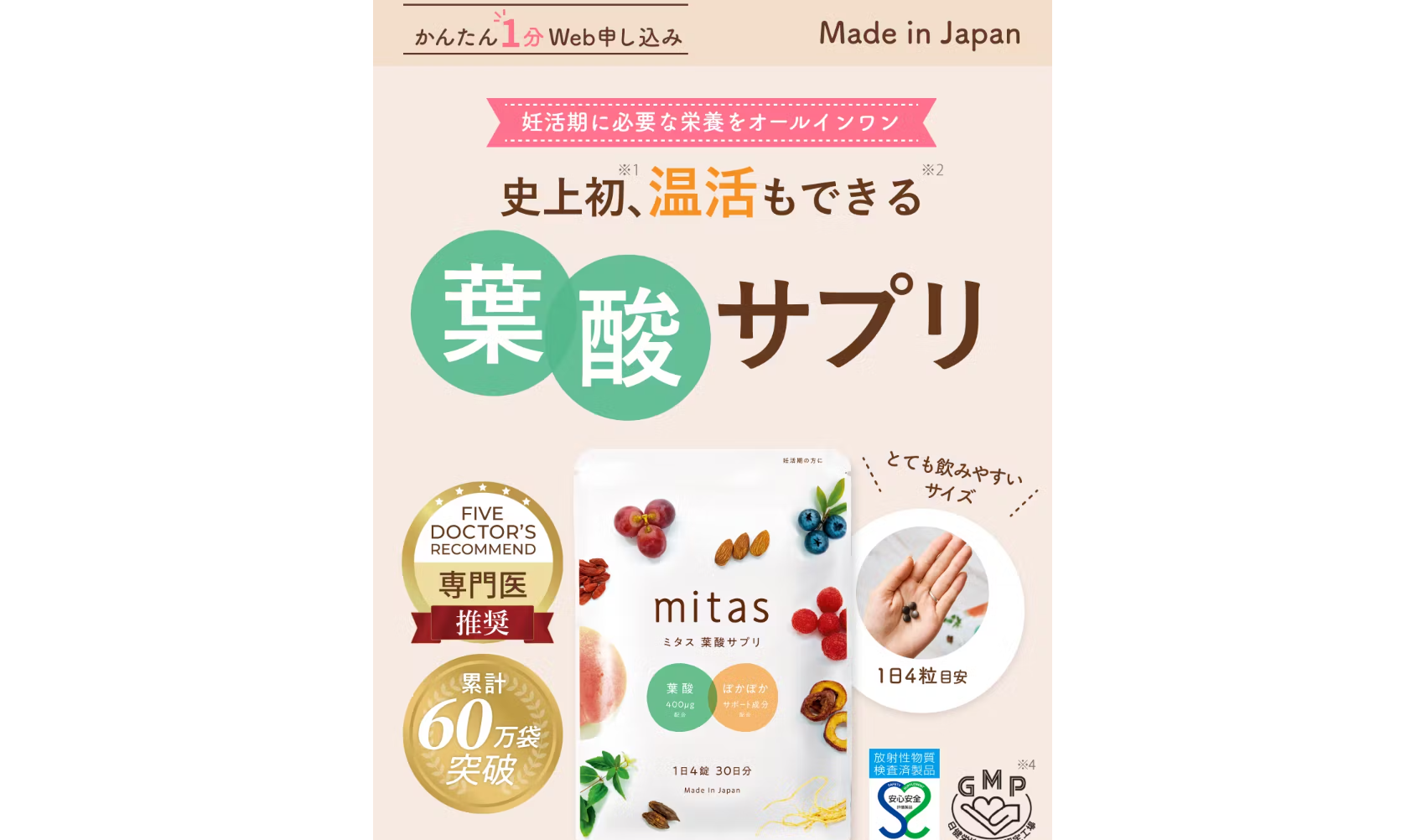 妊活の定番である葉酸は いまやスタンダードな選択です。mitasは その一歩先として 複数の栄養素をまとめて補助し