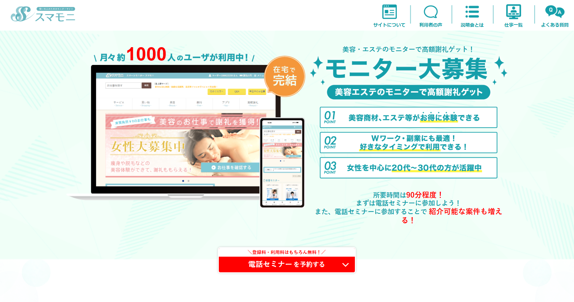 スマモニは、美容・エステなどのサービスを実際に体験し、一般のお客様目線で感想や評価を企業に届ける覆面モニターサイトです。