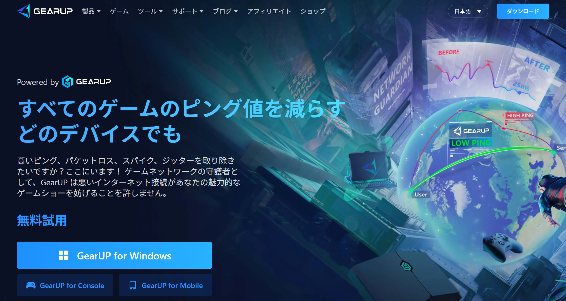 「ラグがひどくてゲームにならない」「PINGが高くてエイムがずれる…」そんな悩みを抱える人向けのゲーム専用ネットワークブースターがGearUPです。