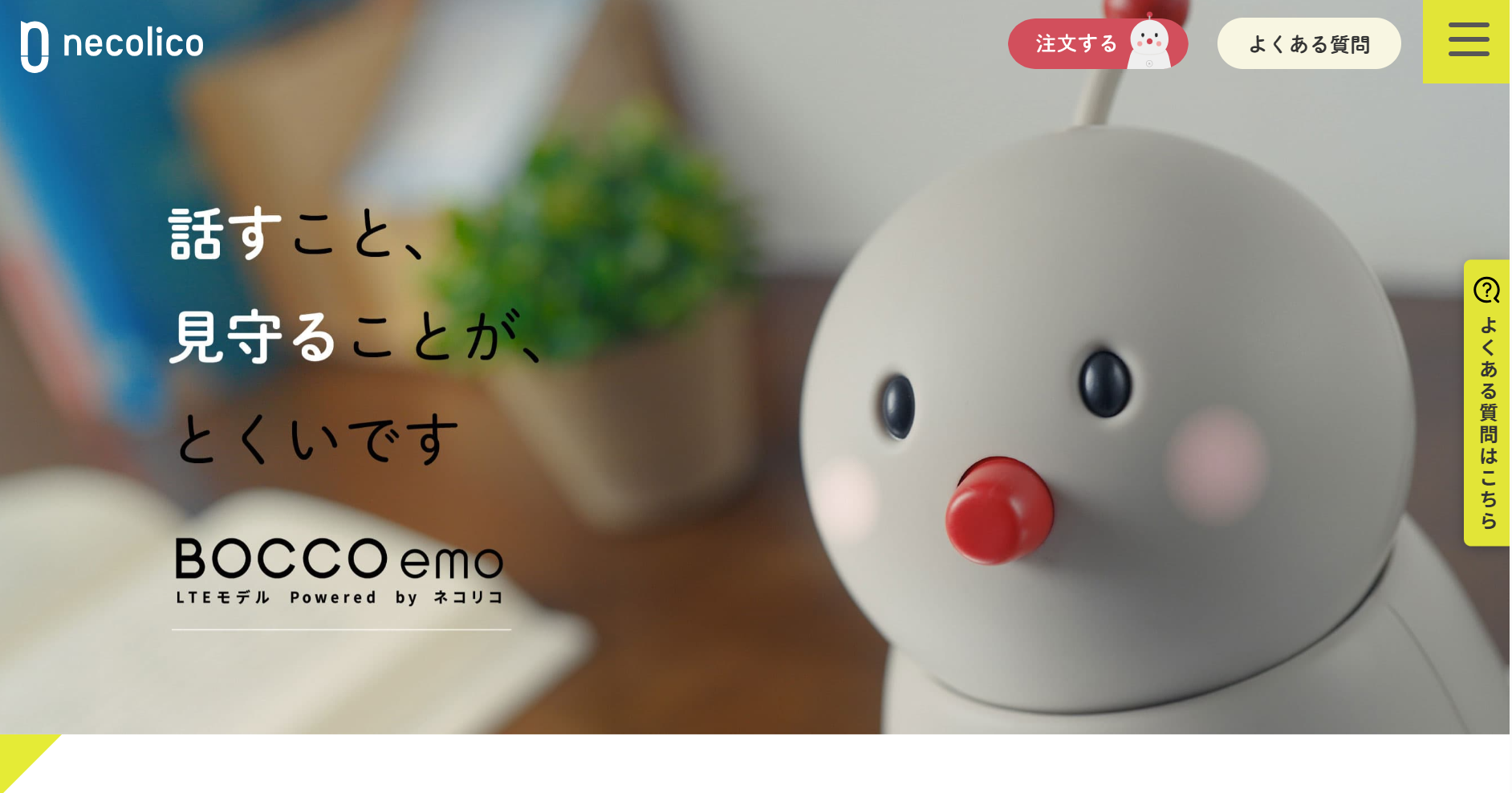 BOCCO emo LTE モデル Powered by ネコリコは、離れて暮らす家族を見守るために開発されたコミュニケーションロボットです。LTE通信機能を内蔵しているため、Wi-Fi環境がない実家でも、電源につなぐだけでサービスを利用しやすいのが大きな特長です。