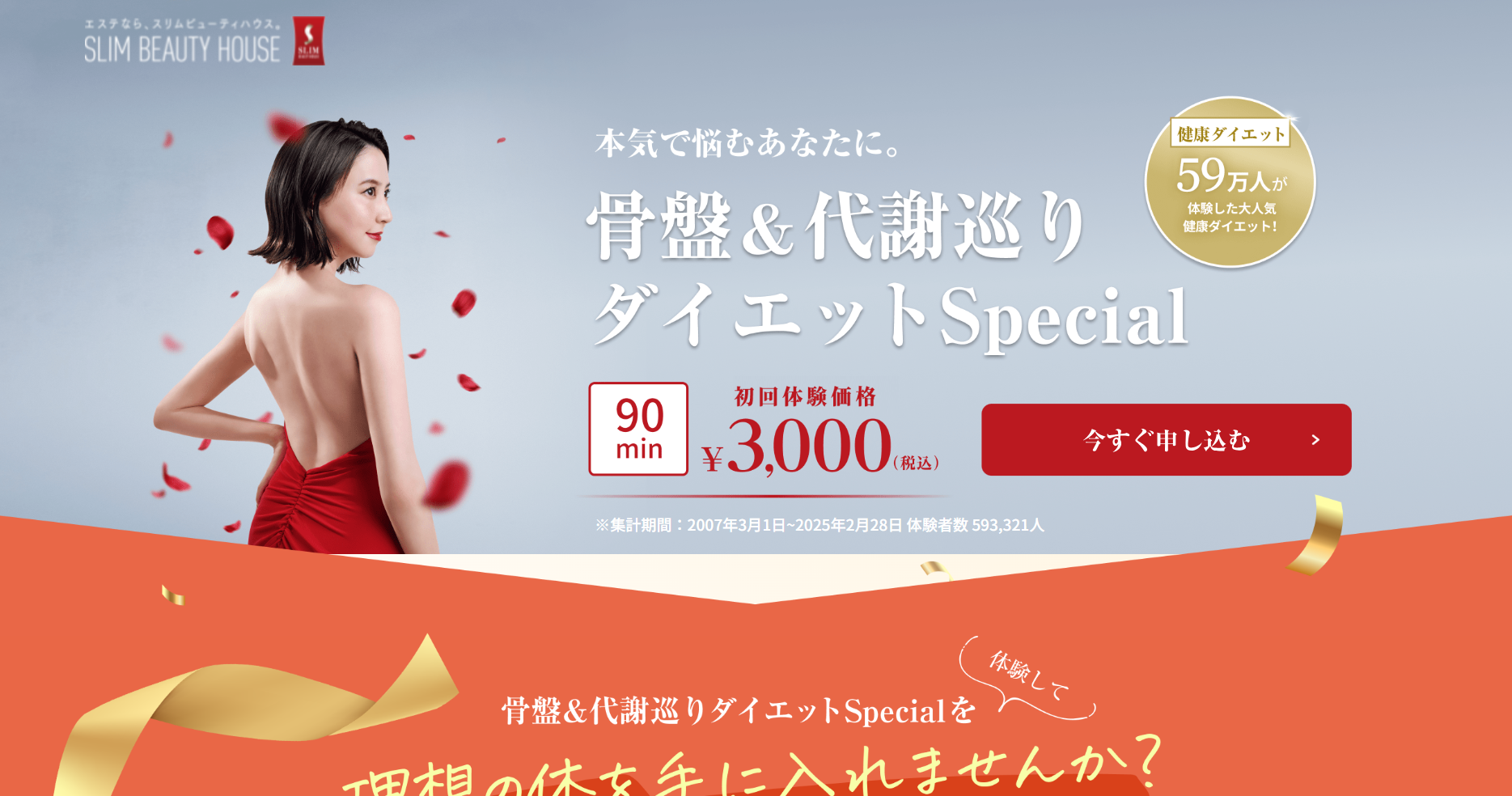 そこで今回ご紹介するのが、40万人以上(※)が体験した実績を持つ、スリムビューティハウスの看板コース「骨盤&代謝巡りダイエット」です。