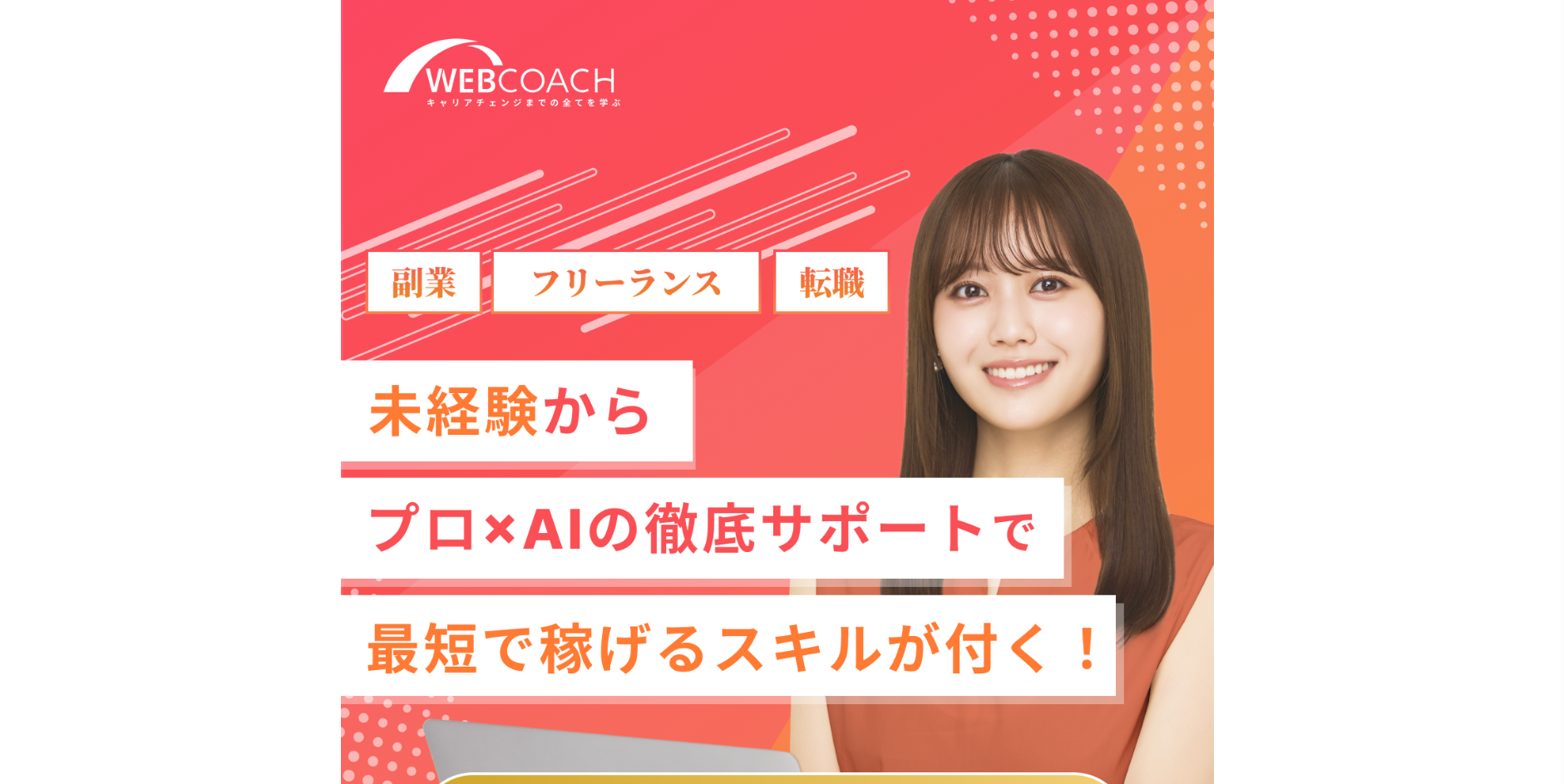 WEBCOACHは、Webスキルと生成AIを横断して学び、現役フリーランスのマンツーマンサポートを受けながら、「自分で稼ぐ力」を育てていくオンラインスクールです。