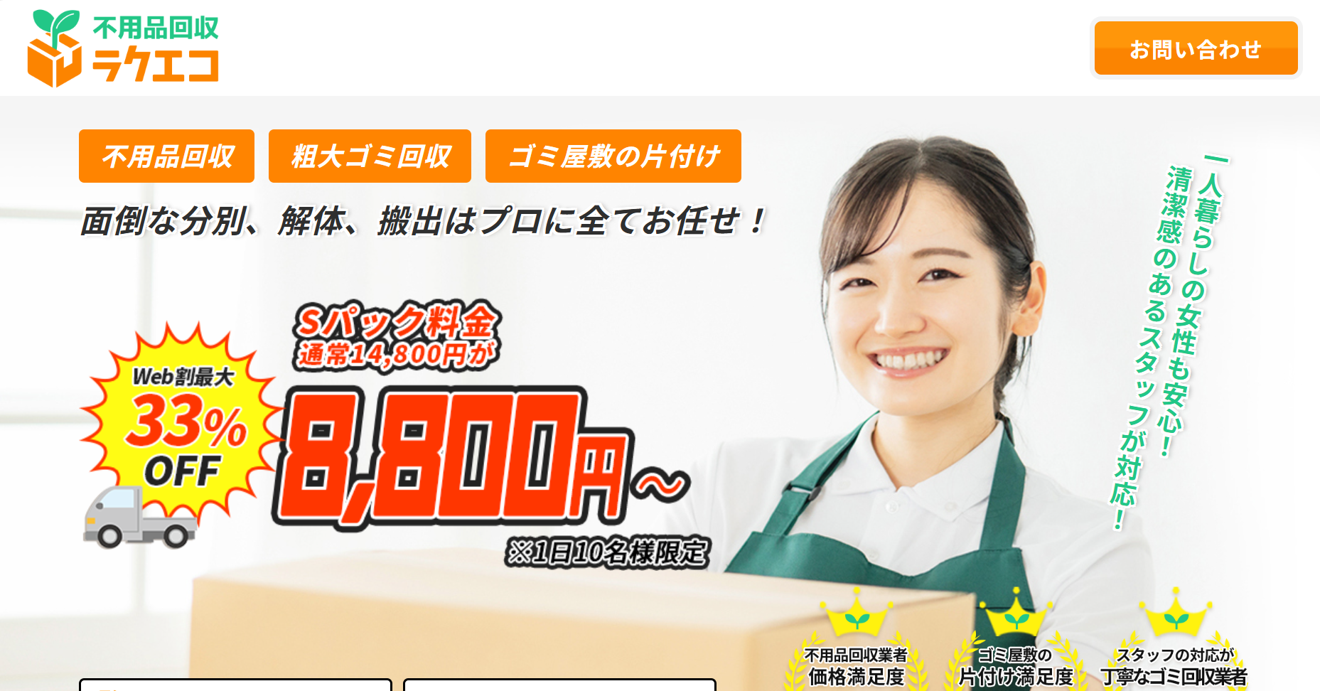 ラクエコでは、インターネットから申し込むことで、パック料金が割引になるWeb割を実施しています。SSパックやSパックなど、各パックが通常価格から値引きされているので、「どうせ頼むならWebから予約したほうがお得」という仕組みです。