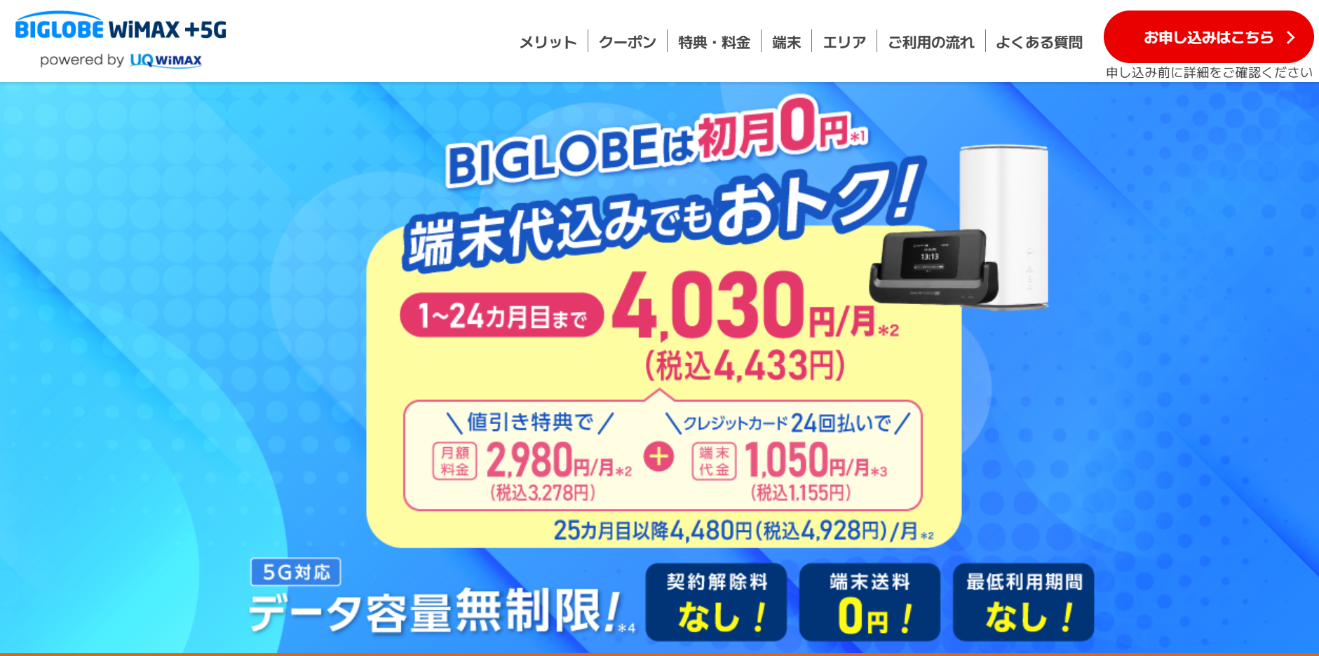BIGLOBE WiMAX +5Gは、5G対応の高速Wi-Fiを無制限に使えるプラン設計に加えて、初月の月額料金が0円(初月解約時を除く)で始めやすいのが特徴です。さらに最低利用期間や契約解除料がないため、「まず使ってみて判断したい」という方でも選びやすくなっています。