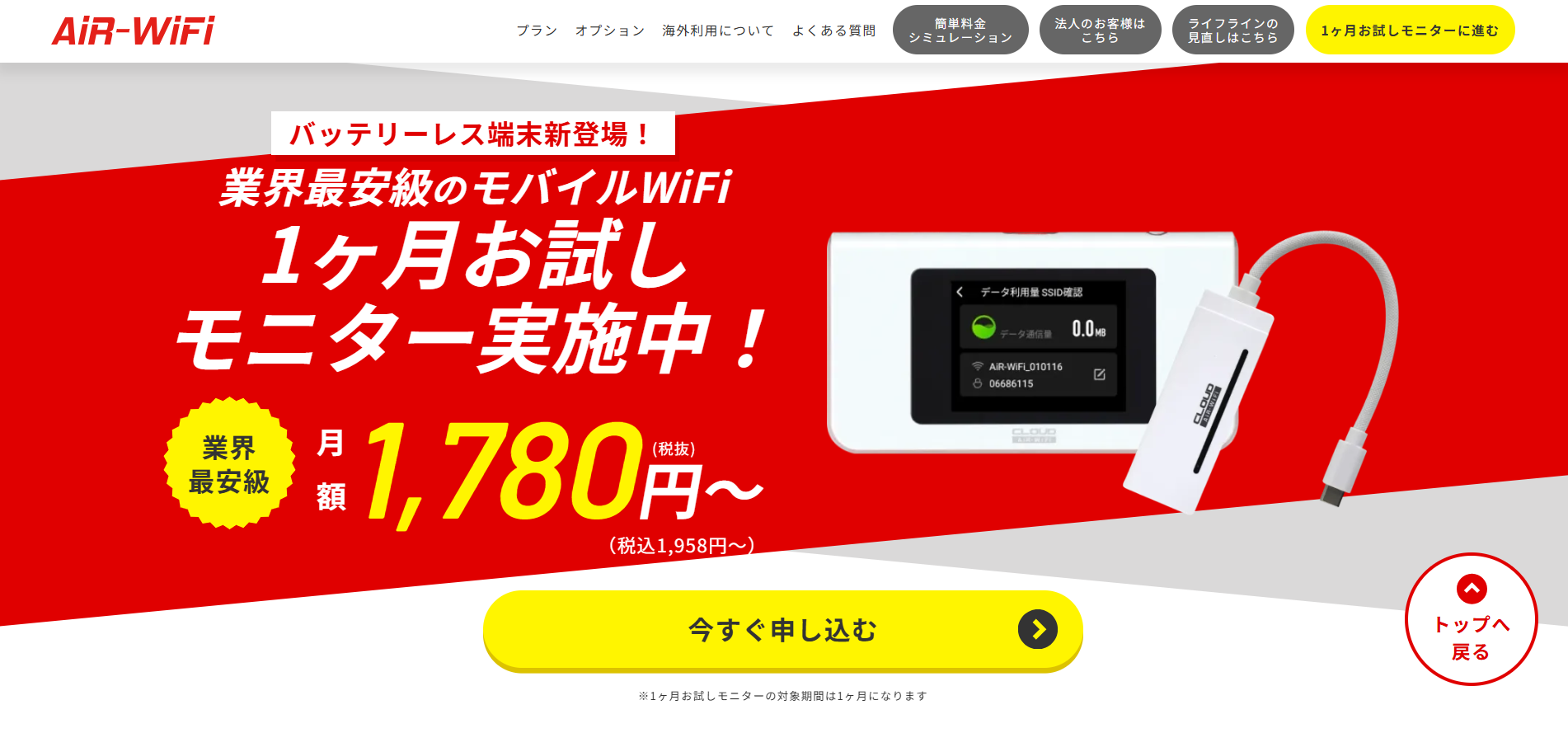 AiR-Wi-Fiは、月額1,958円(税込)からの低容量プランと、100GBの低価格帯プラン、さらに縛りなしオプションまで用意されているため、「料金」「容量」「解約の不安」をまとめて調整しやすいのが魅力です。自分の使い方に合うプランを選べば、固定費を抑えながら必要な通信環境を整えられます。申込みの際は、プランとオプション、利用条件を確認したうえで検討してみてください。