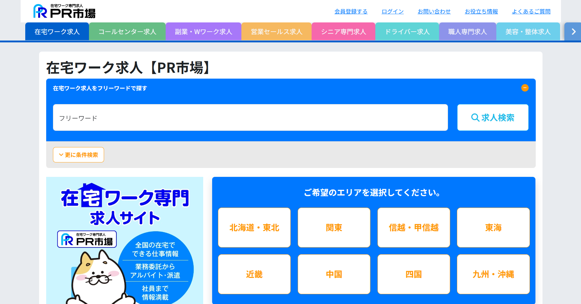 PR市場(いちば)は、業種・職種・働き方に特化した求人サイトで、在宅ワーク、副業、営業、シニア、美容師・整体師、ドライバーなど、目的別に求人情報を探しやすいのが特徴です。全国応募が可能な求人も扱っており、20歳〜75歳くらいまでの幅広い層が「自分の状況に合う求人」を見つけやすい設計になっています。