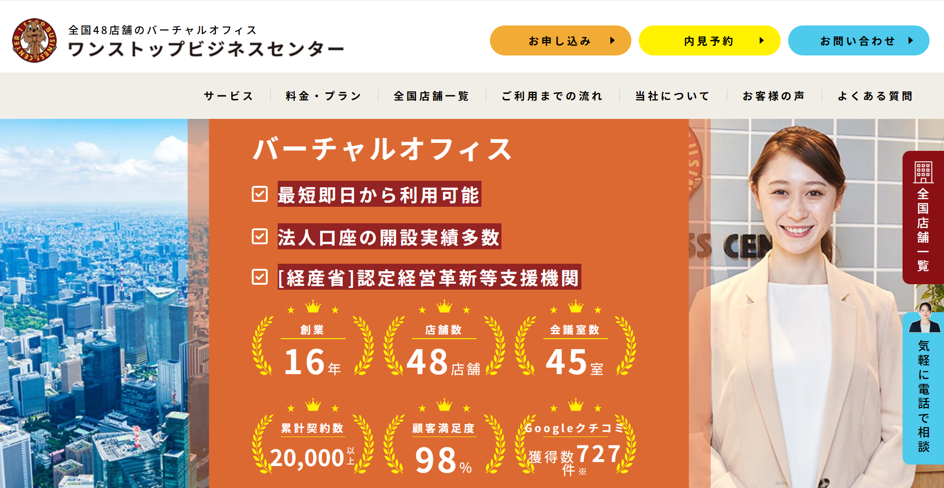 ワンストップビジネスセンター(1SBC)は、青山・銀座・渋谷など東京都心の人気エリアを中心に、法人登記が可能な住所を提供するバーチャルオフィスサービスです。全国40店舗以上の拠点から住所を選べて、定型郵便の無料転送、プランによっては電話転送、拠点によっては会議室利用もできるため、事業の体裁と運用をバランスよく整えたい人に向きます。自宅住所を出さずに副業を始めたい方や、都心住所で信用感を高めたい方は、比較検討の候補に入れやすいサービスです。