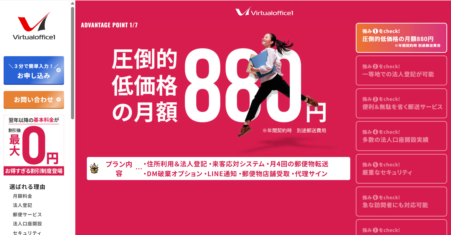 自宅住所を公開せずに開業したい、法人登記できる住所が必要、郵便物や来客の一次対応まで整えたい。そんな「立ち上げ期の困りごと」を、必要最低限の固定費でまとめて整えやすいのがバーチャルオフィス1です。年払いなら月額換算880円で、住所利用・法人登記に加えて、郵便物の転送や通知などの基本サービスがセットになっています。
